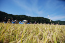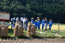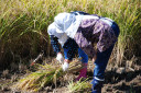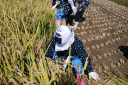 稲刈り体験中の酒田市立田沢小学校の子供達