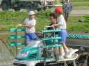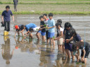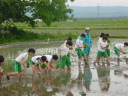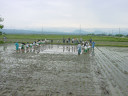 田植え体験中の酒田市立浜田小学校と酒田市立若浜小学校の子供達