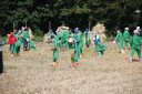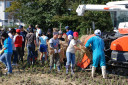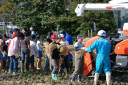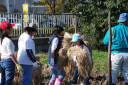 脱穀作業体験中の酒田市立浜田小学校と酒田市立若浜小学校の子供達