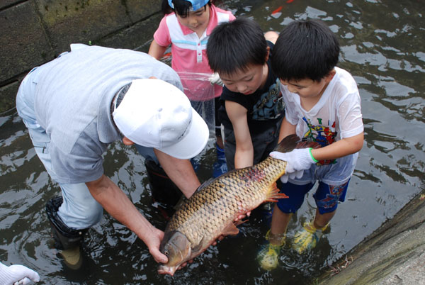 第7回の「水の旅」が開催され、子供たちは色とりどりの魚や大物に歓声をあげていました。