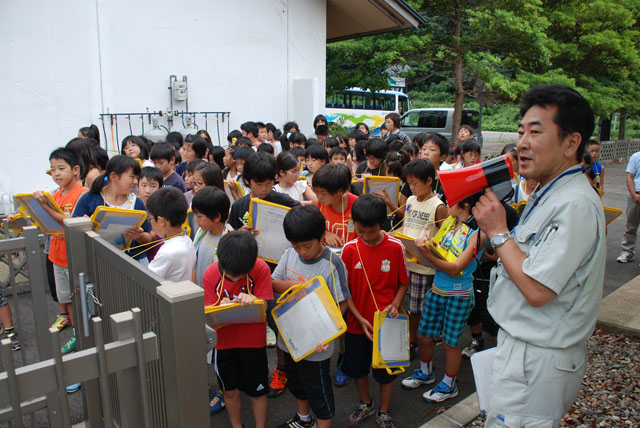 平成24年8月31日(金) 酒田市立松原小学校4年生が校外学習のため草薙頭首工、水管理施設中央管理所、当改良区資料館等を見学しました。 草薙頭首工は対岸からの見学でした。